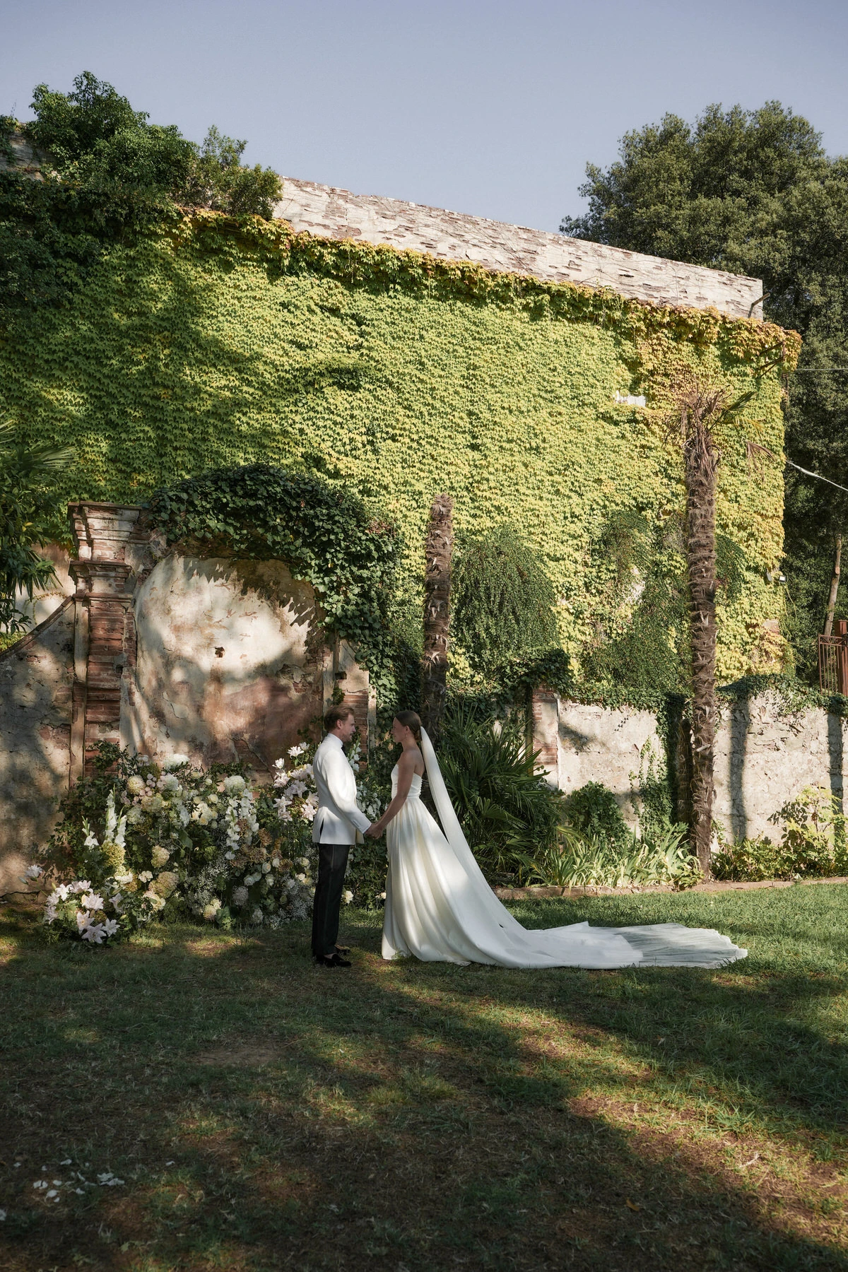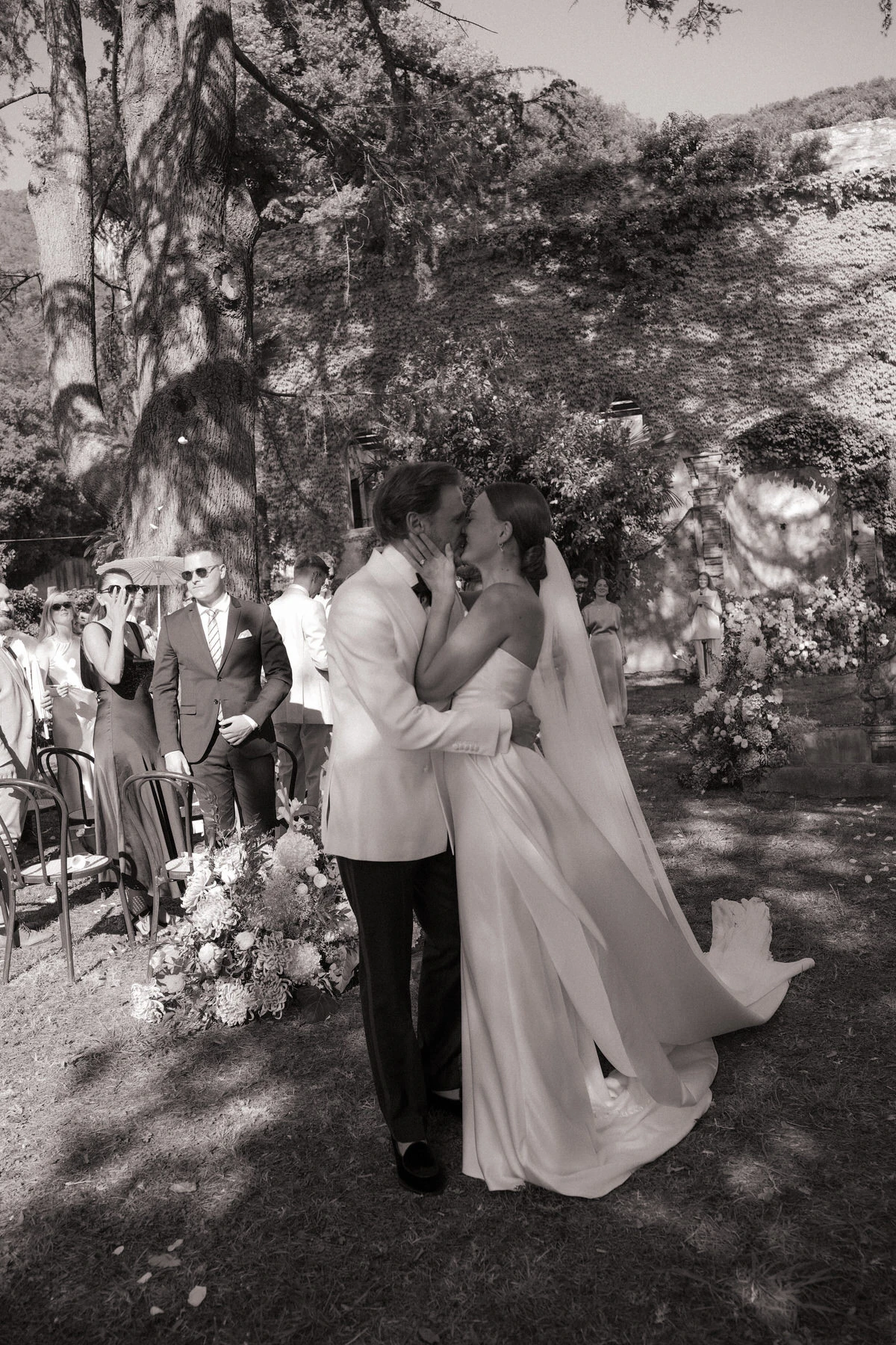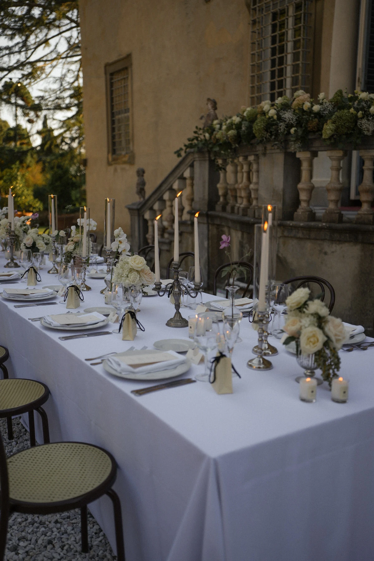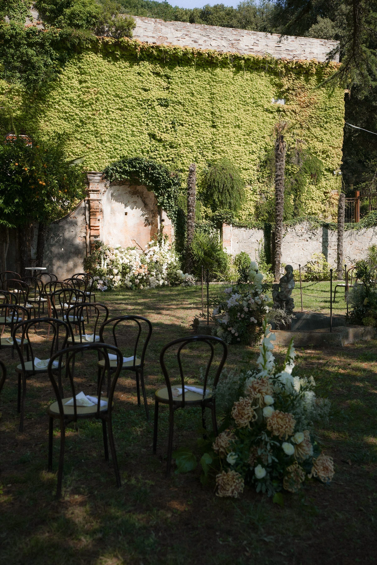 On the wedding day, the gardens of Villa di Corliano offered a stunning setting for the ceremony. The timeless elegance of this historic Tuscan villa, combined with carefully designed floral arrangements, elegant styling, and a beautifully coordinated timeline, created an unforgettable experience for both the couple and their guests.